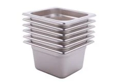 The Gastronorm Pan is one of the most utilised pieces of equipment in the commercial kitchen. However, it can be a tad confusing when it comes to sizing and volumes. So we’ve decided to make things easy and summarise everything for you. Gastronorm sizing is a unique system used to indicate the maximum capacity of a container or pan. It is based on the outer dimensions of the container or pan. The basic Gastronorm measure called GN-1/1 is 530mm Long x 325 mm Wide. All Gastronorm container sizes are measured in relation to this basic measure. The following sizes are for Maxipan Gastronorm Stainless Steel pans. 1/6 Size Steam Pan – 176mm Long x 162mm Wide – Heights/Litres: 65mm/1L, 100mm/1.5L, 150mm/2.3L, 200mm/4.3L.