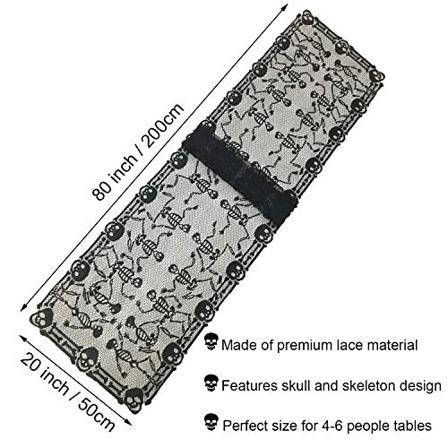 - 💀 Happy Halloween ! this lace table runner features dancing skeletons and skulls, full Hallowen atmosphere, perfect for home party table decorations or creating spooky Halloween scene in haunted house.