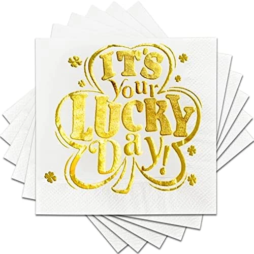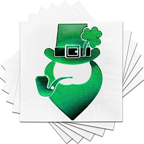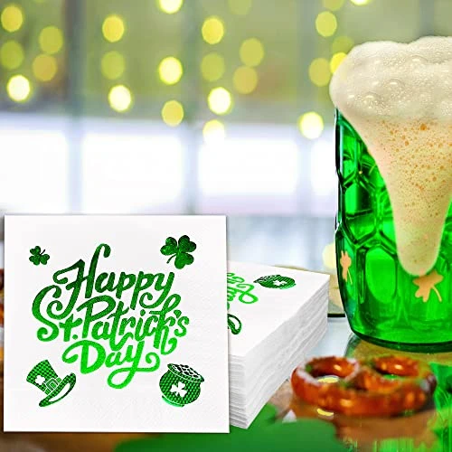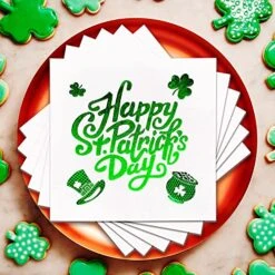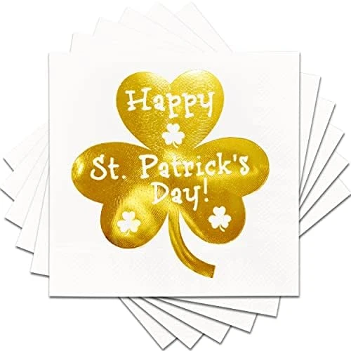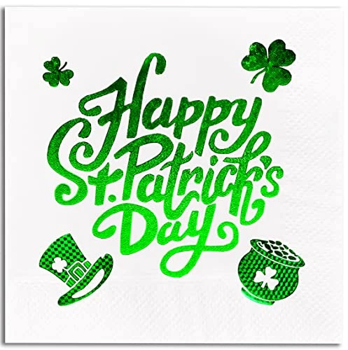 Happy St. Patrick´s Lucky Day Napkins Cocktail Paper White – Green Foil 100 Pack 2 Ply 5×5 Inches Party Supplies