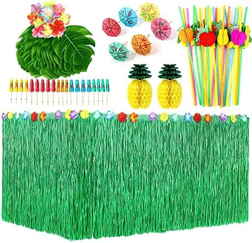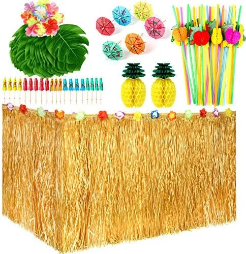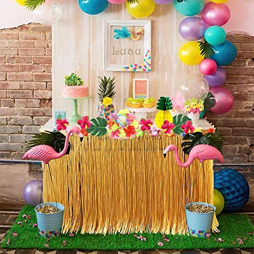 - Super Value Party Pack: Gold grass table skirt with hibiscus flowers at the top of edge, durable, can be used repeatedly! We stand behind our products to provide high-quality party decoration! 100% money back if you are not satisfied with this party pack.