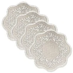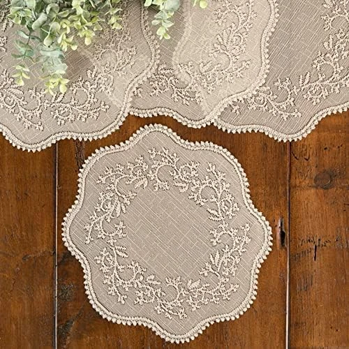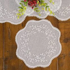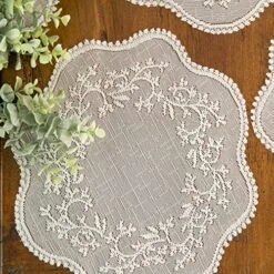 Trailing floral vines on a very sheer background — simple and striking, airy and adaptable. The background mesh of Sheer Divine doily has a texture resembling fine linen, embellished with small vine motifs.