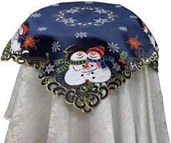 - Durable navy blue satin material with winter scene of appliqued and embroidered cute snowmen with hats and scarves, red poinsettia, holly leaf, berries, white snowflakesβ¦