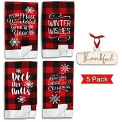 - 5pc Red Plaid Towel Set: Red Buffalo Check Printed kitchen towels are a festive accent for your kitchen during the Christmas season. They each measure 15×25-in. and have the buffalo check pattern with Christmas sentiments. TYou’ll love them with your holiday decor, practical use in the kitchen, and for gift giving. Includes one CM Originals ‘’Thankful’’ Ornament