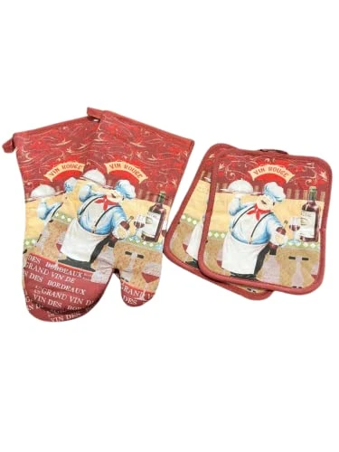 Italian Chef Vin Rouge Wine Themed Kitchen Linen Set – Includes 2 Oven Mitts And 2 Pot Holders