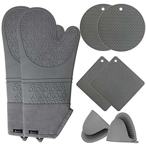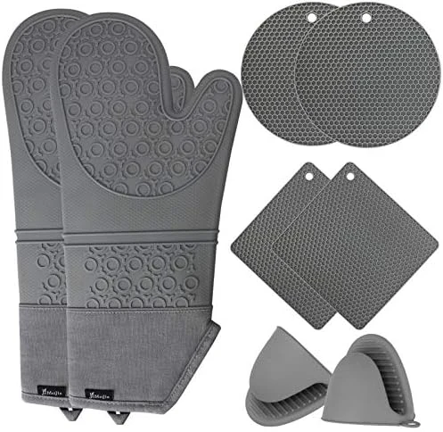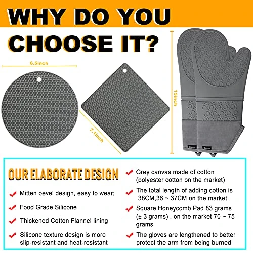 - FIRST-CLASS QUALITY – Our oven mitts kit is made of high-quality food-grade silicone material, BPA-free, with excellent flexibility, stability and elasticity, no yellowing, and not easy to deform, high tear resistance, high insulation, wear resistance, high and low temperature resistance, flame retardant type, anti-aging, environmentally-friendly, can resist up to 500°F (260°C) of high temperature, say goodbye to burns.