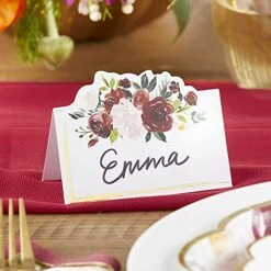 - MEASUREMENTS -Each card measures 3.5 in. x 2.5 in. The set of 50 cards are packaged securely in shrink wrap. Each place card features a 3D burgundy floral bouquet at the top, with a gold foil stroke along the bottom. These place cards are made of high quality paper that is easy to write on. CONVENIENTLY Sold in a set of 50