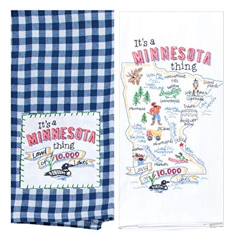 Kay Dee Designs Minnesota Map Home State & Souvenir Embroidered Dish Towels, Bundle Set of 2 State of Minnesota Kitchen Towels. It’s A Minnesota Thing! These kitchen dishtowels are more than just a pretty accent; these practical and versatile pieces can pull their weight around the kitchen. Perfect to line a serving basket or tray, or cover rising bread dough and keep food warm like scones, biscuits and rolls. Set includes 1 appliqued State of Minnesota Tea Towel in blue gingham. Embroidered Minnesota state name and state symbols of the wood duck and land of 10,000 lakes. Tea Towel is 100% cotton, measures 18 in x 28 in. with sewn in loop for hanging. Set includes 1 Embroidered State of Minnesota Flour Sack Towel featuring locations of Grand Rapids, Duluth, St. Cloud, St. Paul, Minneapolis and more. Also embroidered symbols of Aerial Lift Bridge, moose, Split Rock Lighthouse, walleye, lumberjack and more. Flour Sack Towel is 100% cotton, measures 17.5 in x 28 in with sewn in loop for hanging. Whether you have pride in your home state or you visited a spot that spoke to your senses, take the memories home with these functional towels, featuring embroideries of the essential landmarks and scenery of your state that you have come to know and love, or a place that you never want to forget.