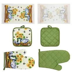 - Functional: Our soft, super absorbent sunflower kitchen towels are the perfect wiping surface and mop up any spill. The thick, cushioned sunflower kitchen mittens and pot holder set protect your hands from any hot pot or stove.