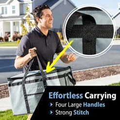 - 🍔 Effortless Carrying: Large handles (top and side) make this insulated tote easy to carry while the removable interior board keeps things stable and side pockets hold onto napkins etc. The heavy duty zipper means this portable food carrier easy to open and close, plus… it’s collapsible for storage!