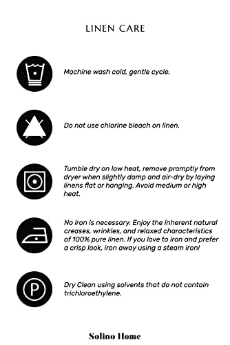 - Easy Care -Machine Washable, Tumble Dry, Low Iron as Needed, Steam Iron for a crisp look. The beauty of each pure linen piece is the natural fibers and classic aesthetic that mellows with each washing, betters with age and requires minimal care.