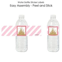 - Water bottle stickers each SIZE 8.5″ wide x 2″ tall, perfect for any beverage bottle or container less than 8.5″ in diameter. EASY TO USE: Prepare your water bottles or containers by ensuring they are room temperature and dry. Removing the original bottle label is preferred but not necessary. Carefully peel one pink and gold sticker label from the backing and adhere to a bottle, starting at the middle and pressing toward edge. Smooth label around container and chill your beverages if needed.