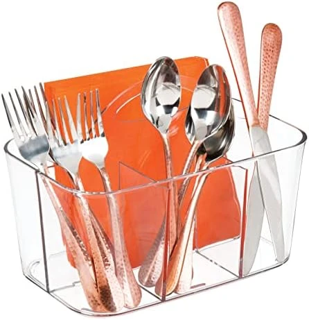 - PORTABLE: Built-in handle makes it easy to transport tote caddy in and out of cabinets and around the home; Easily transports from cupboard or cabinet to table or countertops and islands; Ideal for outdoor dining; Perfect for picnic tables, patios or decks – just grab and go