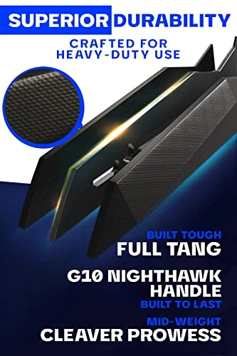 - Striking angles, long durability: A midnight black ergonomic, fiber-resin and military grade G10 handle is nearly impervious to heat, cold and moisture. The handle geometry is uniquely designed to tuck snuggly into your palm, giving you a firm grasp regardless of the grip style you use. A hand-polished spine is smooth and comfortable to the touch while the G10 handle is slightly textured to provide anti-slip properties