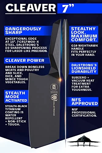 - Dalstrong Shadow Black Series Power: Featuring high-carbon 7CR17MOV-X super-steel with an added vacuum heat treatment at 58+ HRC which allows for extraordinary performance and edge retention. Unforgettable styling, sophistication and functionality, sure to turn heads in any kitchen. Each blade comes with a matching black space-saving sheath. National Sanitation Foundation (NSF) certified