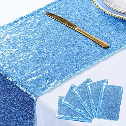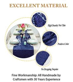 - Table Runner: 2pc 12×108-inch navy blue sequin table runners. This rectangle table cover can fit a 6ft/8ft rectangular table or round table well. This sparkly wedding table runner is great for event table decorations.