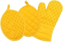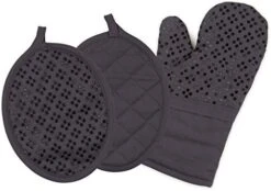 - NON-SLIP GRIP & HANGING LOOP: The printed silicone design on the oven mitt and hot pads provides a secure non-slip grip while handling pots and pans. It is rated to withstand up to 500 degrees Fahrenheit for your safety and ease of use. The oven mitt and pot holders are perfectly designed with a loop for easy hanging.