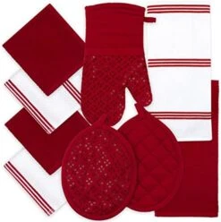 - GIFT: Decorated with charming, chic packaging, this 9 piece kitchen towel, oven mitt and pot holder set makes a great hostess, wedding, birthday, college, apartment essentials or housewarming gift.