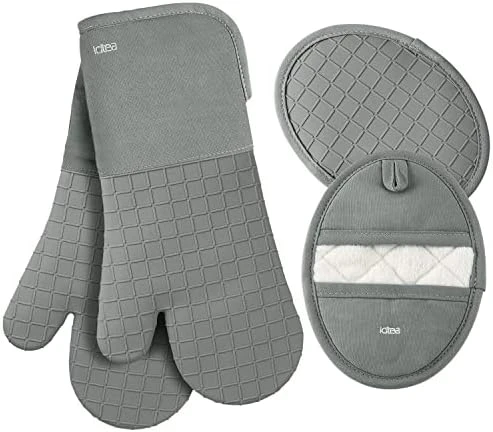 - THICKENED ANTI-SLIP TEXTURE – Oven mitts and pot holders silicone surface having mesh stripes design and cotton twill provides better control and stability. You don’t need to worry about items sliding out of your grasp. And the 100% soft cotton terry lining adds extra protection and comfort.