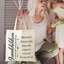 - 💎MEMORABLE GIFT FOR NANA: Personalized Grandkids Totes Bags are so useful & great gift. You can use this Totes Bag in many different areas like Work, Shopping, Beach, Travel, Gym, School/College, Books Bag & Reusable Grocery Bags. These cool Personalized Canvas Totes Bags are one of the best gift ideas for Christmas, Birthday, Wedding, Honeymoon, Thanksgiving, Housewarming, Honeymoon, Mother’s/Teacher’s Day, Bridesmaid Party, Anniversary, Valentines, Engagement, Birthday Girl’s for Nana, Mom.