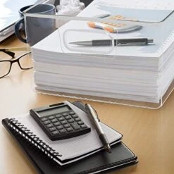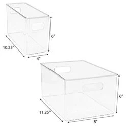 - DURABLE DESIGN — Clear organizer bins made of strong clear plastic — Built-in handles — Stackable — BPA-free — Chlorine-free — Clean by hand — DO NOT place in dishwasher — Approximate Measurements: (1) LARGE 11.25” L x 8” W x 6” H — (2) SMALL 10.25” L x 4” W x 6” H
