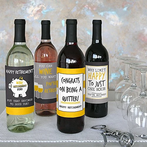- UNIQUE RETIREMENT GIFT IDEA: Retired Wine Bottle Labels also make a great gift idea. Add Retirement Party Wine Bottle labels to a favorite bottle of wine or spirits for a special Retirement gift. Use each wine label on a favorite beverage bottle and gift individually or create an impressive Retirement gift basket using all 4 labels on coordinating wine or liquor bottles. Wine bottle labels will easily give your Retirement gift a personal touch!