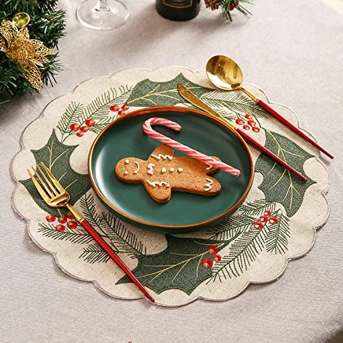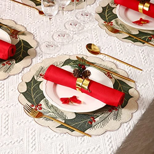 Round Placemats Set Of 4, 15 Inch Christmas Placemats With Holly Leaf, Rustic Linen Dining Table Mats