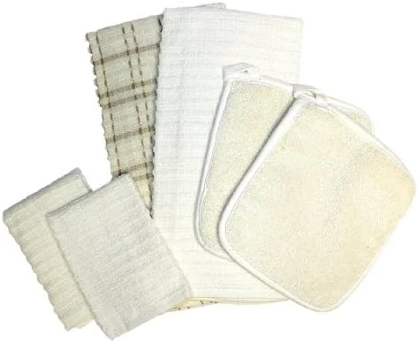 - Basic kitchen set includes: 1 solid kitchen towel, 1 checked kitchen towel, 2 solid dish cloths, 2 pocket mitts, natural color