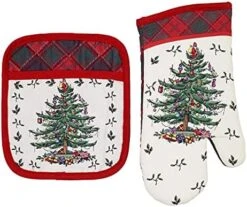 - Festive Kitchen – The 3 pc Kitchen Towel Set features the classic Spode Christmas Tree design, with a tartan plaid border and sprays of holly and berries.
