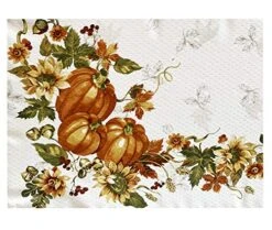 - STYLING: The Lintex Stockbridge Pumpkin Harvest Bordered Thanksgiving, Easy Care Fabric Tablecloth features a 4 sided border with bold pumpkins on their vines with sunflowers, fall leaves and acorns and a center rectangular leaf garland pattern on a two tone beige leaf background with a rust border.