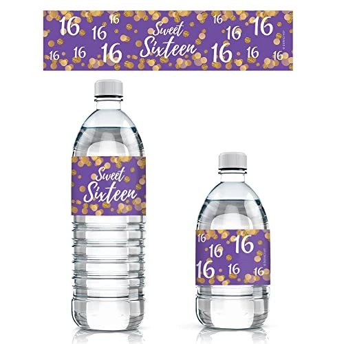 - EASY TO USE: peel and stick around water bottles for sweet 16 party favors to match purple 16th birthday party decorations.