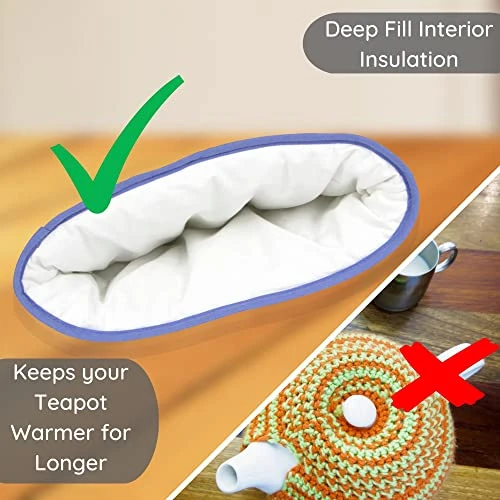 - 100% Cotton Tea Cozy – This insulated tea cozy is made from 100% cotton with a deep fill interior. This keeps your teapot warmer for longer. Finished in a linen weave cotton with a blue trim and light interior.