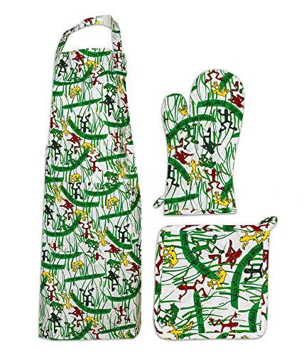 The Kosher Cook Passover Kitchen Linen Set – Frog Print Design – 100% Cotton – Apron – Pot Holder – Oven Mitt – Pesach Seder And Kitchen Accessories