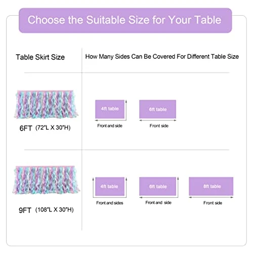 - 🎉【Easy Install】: The tutu skirt for table is easy to install and fix. The unicorn rainbow table skirt tulle package comes with velcro adhesives to make installation easy and fast. Stick the velcro on the table and put the ruffle table skirt top edge right on the velcro, done! You can finish it quickly even for beginners.