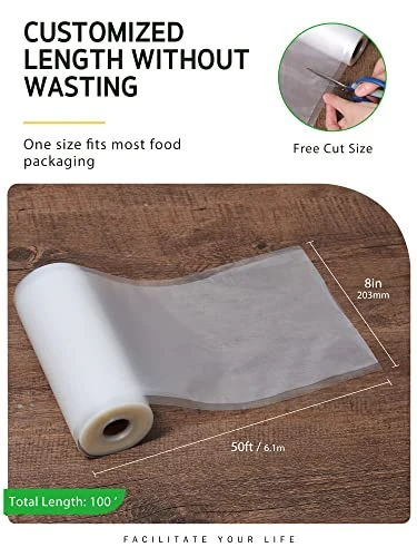 - Free Cut Size with No Wasting: 2 Roll 8″ x 50′(total 100’), roll packing design, allows you to custom-sized length according to food package needs. Prevent waste space.
