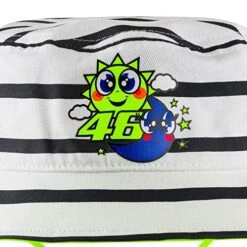 - Baby hat part of Valentino Rossi’s VR46 Classic 2020 collection. The model is bucket hat type and made of cotton and polyester with striped pattern. There is a large number 46 Vale rides with in MotoGP on his Yamaha M1 and a nice caricature of the Sun and Moon.