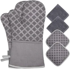 - OVEN MITTS & POT HOLDERS TOWELS SET: This kitchen mittens set is equipped with 2 oven mitts, 2 pot holders and 2 kitchen towels. The baking gloves can be used to hold hot kitchen utensils to prevent burns on your hands, the pot holders are suitable for holding hot pots, pans, plates, trays and baking tools to prevent burns on the table. And our gloves and pot holders with built-in hooks are machine washable and dryable, making them very easy to clean and store