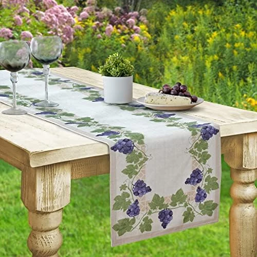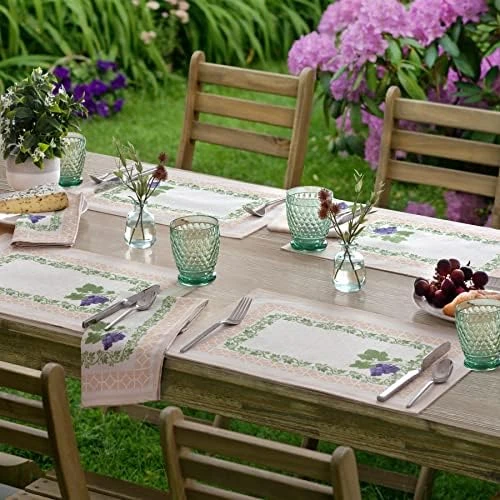 - STYLING:The Provence Bordeaux Wine Grapevine Bordered Print Country French Fabric Napkins by Home Bargains Plus is indoor and outdoor, stain resistant, water resistant, and wrinkle free. This magnificent wine grape pattern features deep purple grapes on green vines on fully engineered borders of linen and beige trellis motifs on a beige background.