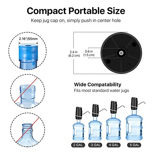 - UNIVERSAL MODEL FOR CROWN & SCREW TOP: Unnecessary to open the lid, this drinking water pump is suitable for most 5 to 6 gallon barrels with a 2.16-inch neck and fits excellent with both the crown top or screw top water bottles.