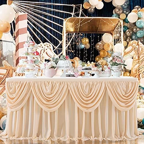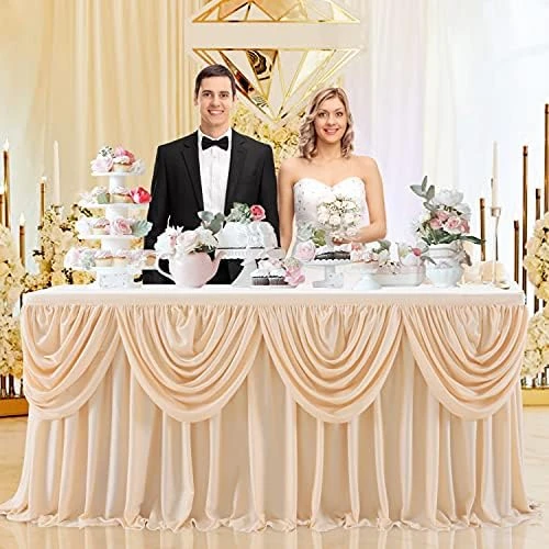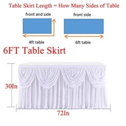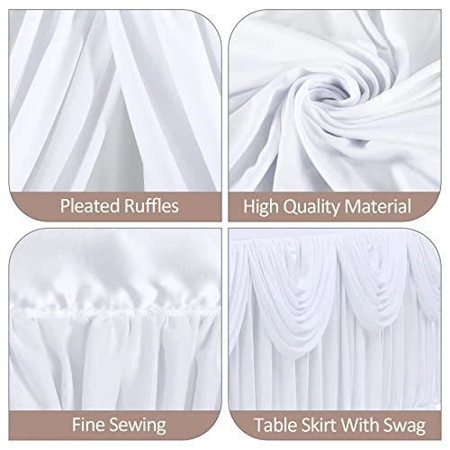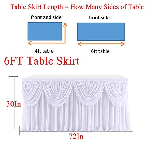 - Chiffon table skirt applicable occasions: White table skirt perfect for wedding, birthday party, banquet, gender reveal, anniversary party, concert decoration.The classic table skirt with drapery will make your party more complimentary.