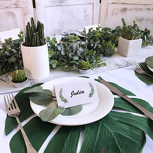 - A bright white background with the guest name/table number is surrounded by eucalyptus leaves.Easily guide your guests to their seats, and keep your evening flowing effortlessly from one event to the next with these elegant place cards.The place cards could also be used for a birthday party, wedding party, anniversary party, bridal showers, baby showers, Christmas, Thanksgiving, or a dinner party.