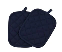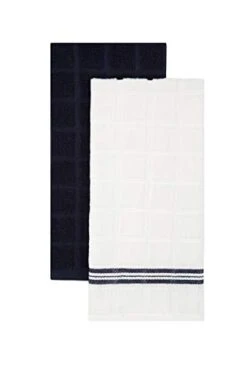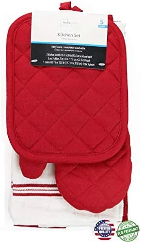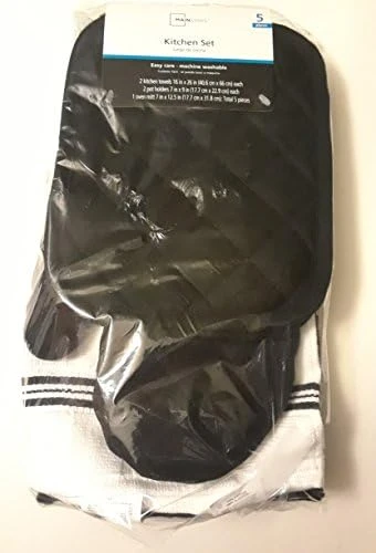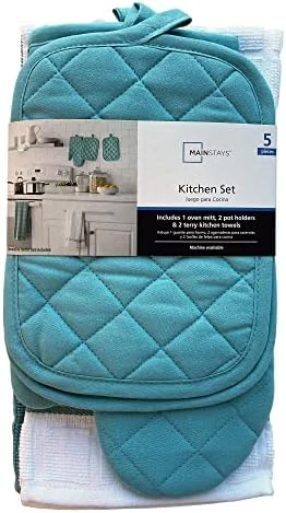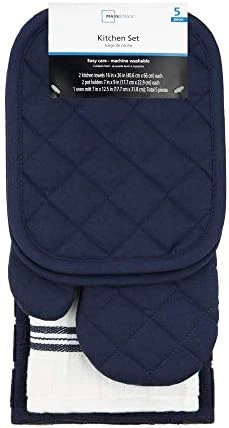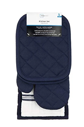 Mainstays 5 piece kitchen towel set in Navy Blue. Set includes 2 kitchen towels, 2 pot holders, 1 oven mitt. Machine washable