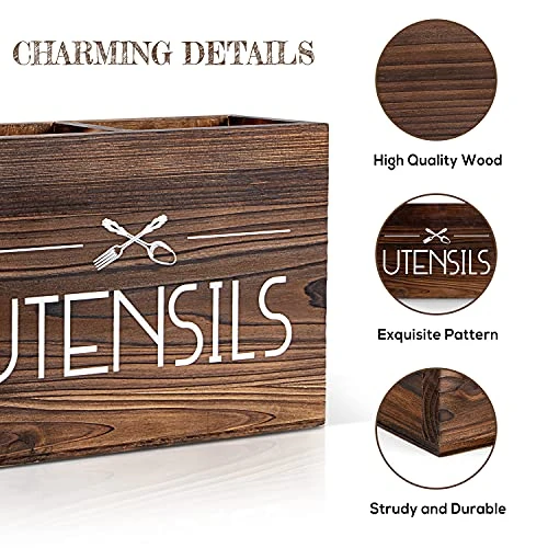 - RUSTIC FARMHOUSE DECOR: The wooden utensil caddy is cute and beautiful in appearance. This farmhouse style kitchen utensil holder can match your kitchen style. It is the perfect decorative touch to your kitchen countertop.