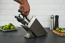 - Self-sharpening knife block: inside the slots are ceramic knife sharpeners that grind the knives when removed